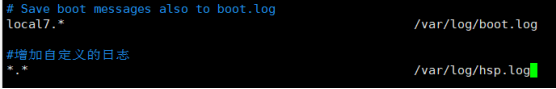 案例(自定义一个日志):在/etc/rsyslog.conf中添加一个日志文件/var/log/hsp.log,当有事件发送时(比如sshd服务相关事件),该文件会接收到信息并保存