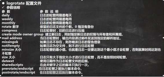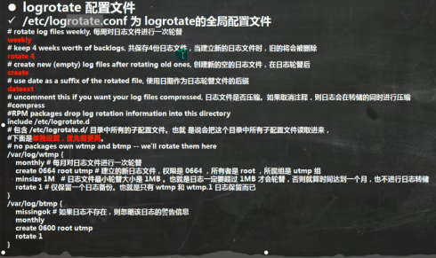 日志轮替就是把旧的日志文件移动并改名,同时建立新的空日志文件,当旧日志文件超出保存的范围之后,就会进行删除。/etc/logrotate.conf:是全局的日志轮替策略/规则,当然可以单独给某个日志文件指定策略。