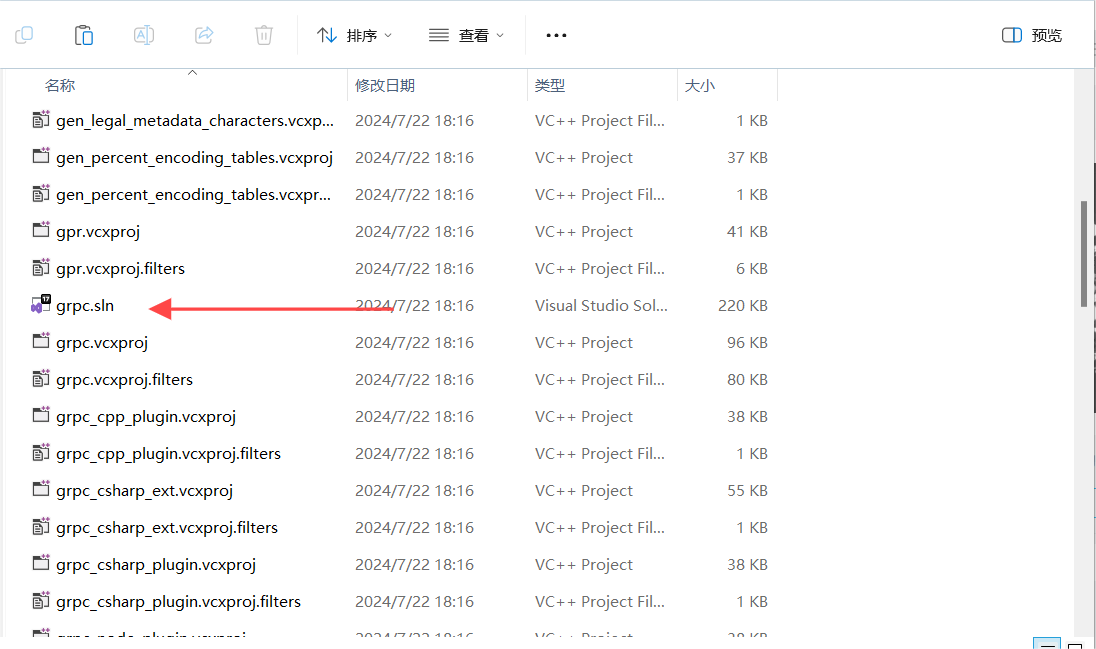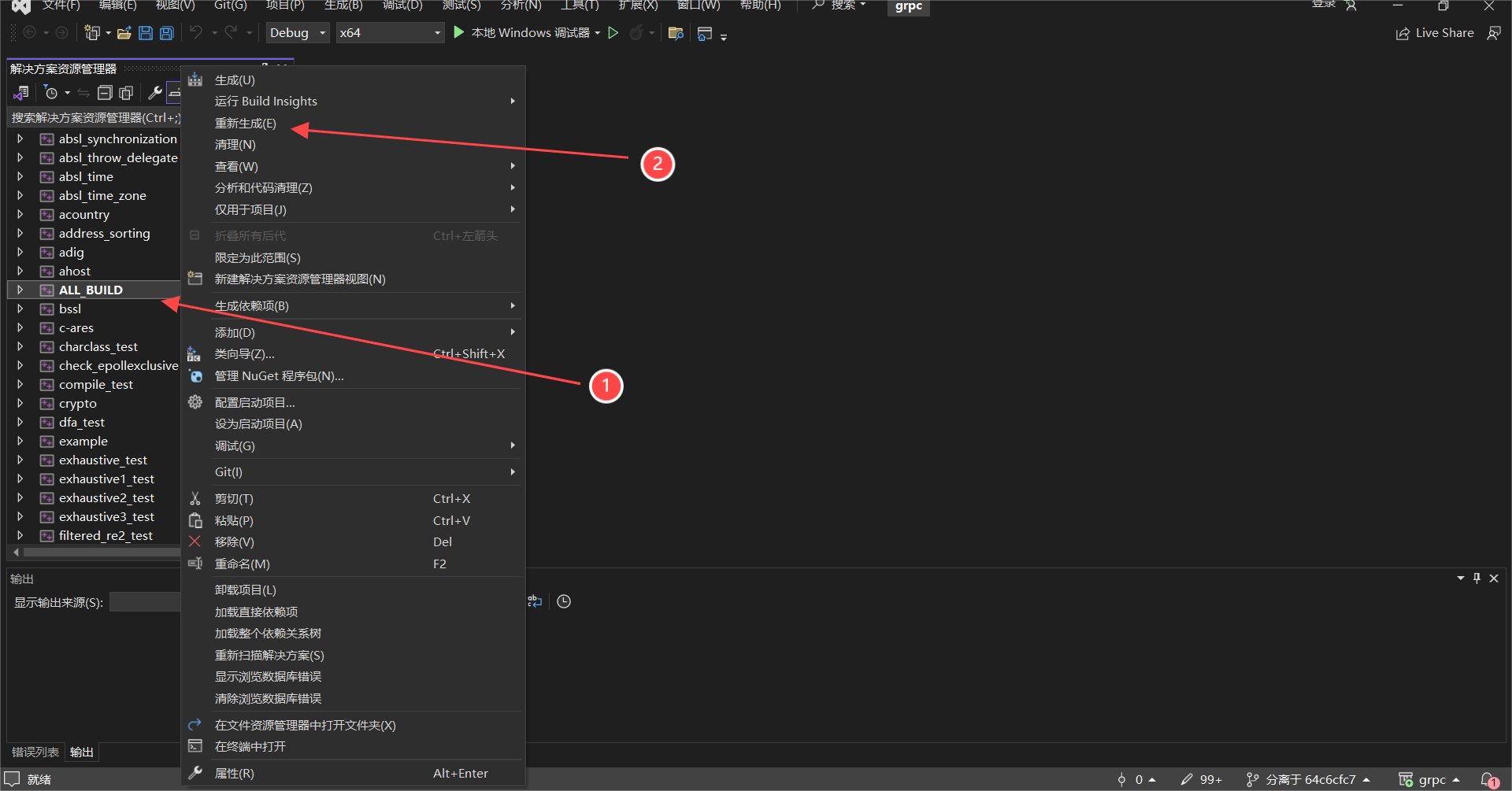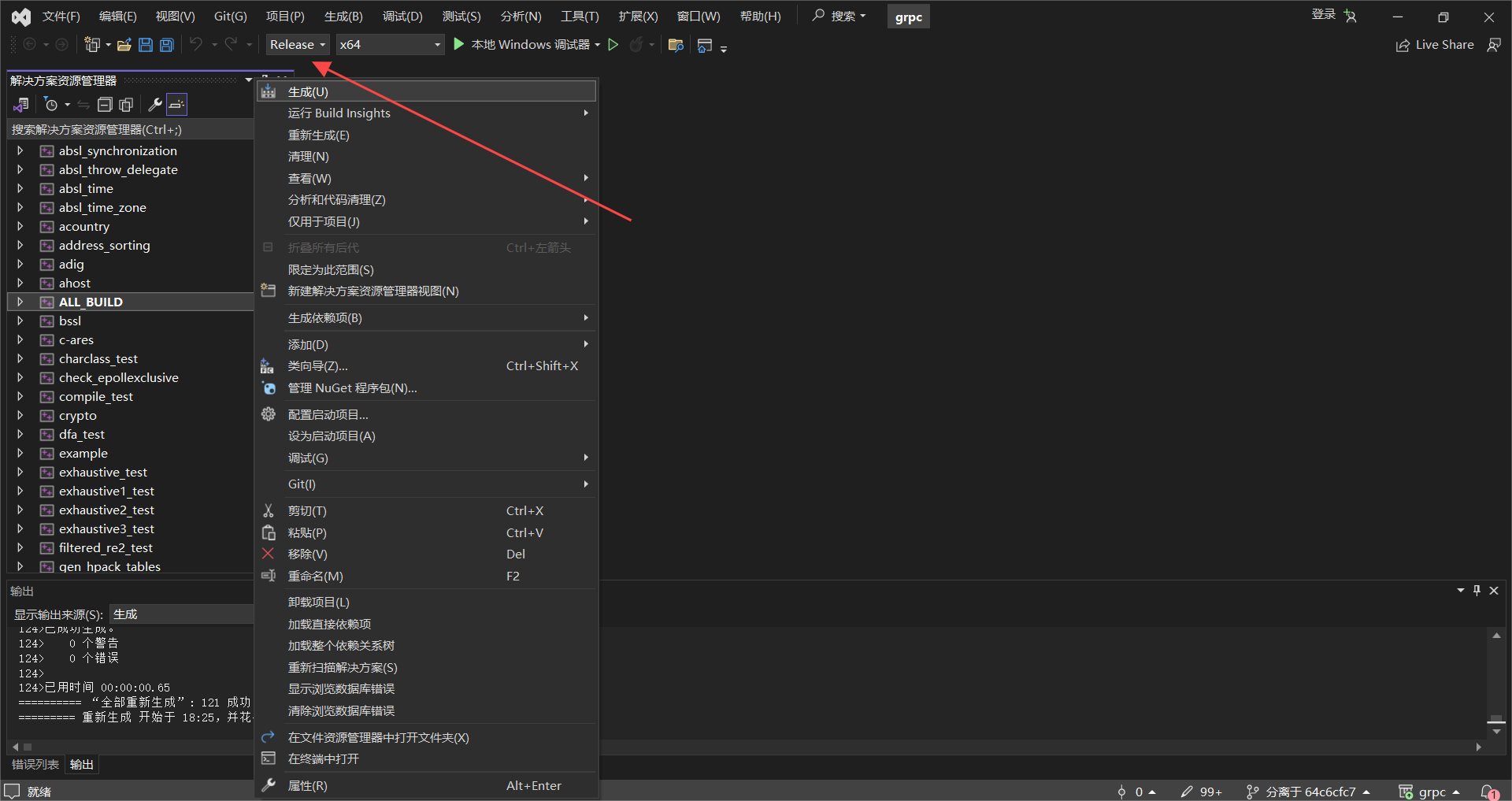 其中grpc.sln是创建的工程的路径,点击打开,出现以下界面,找到ALL_BUILD,右键选择重新生成(时间有点长)。