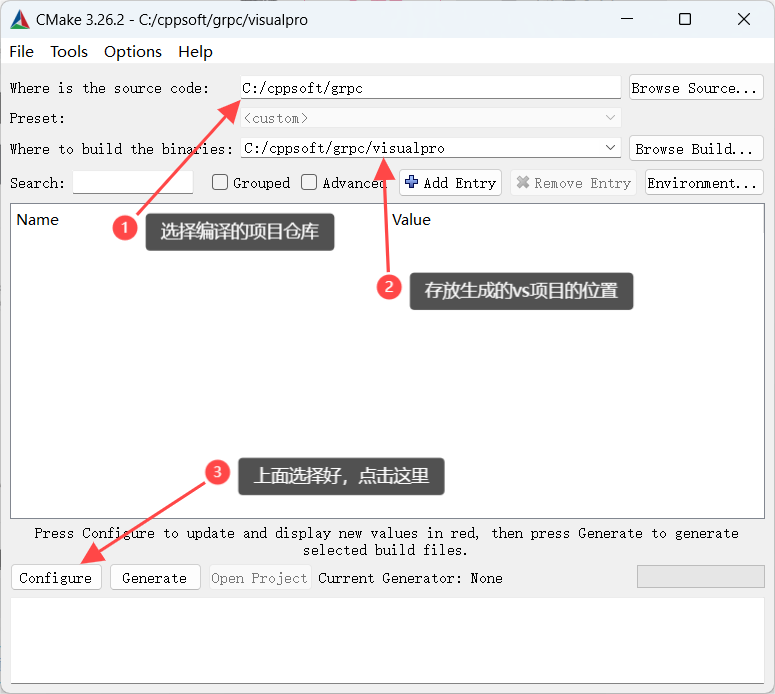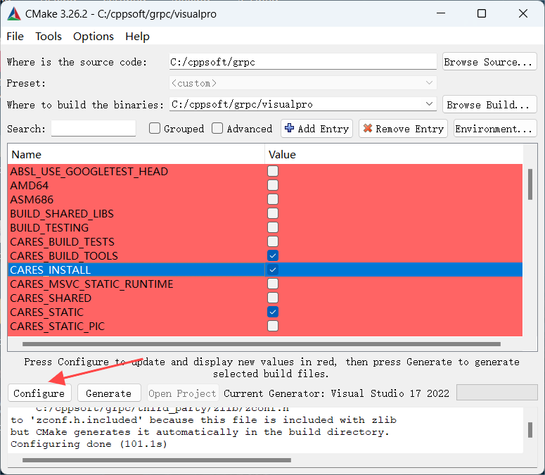 点击Finish后,等待编译,完成后就得到以下界面,不需要修改,直接点击Configure,生成配置。**(到这里可以先完成go和NASM的安装,因为不确定在接下来的grpc编译和生成中会不会需要它们)**
