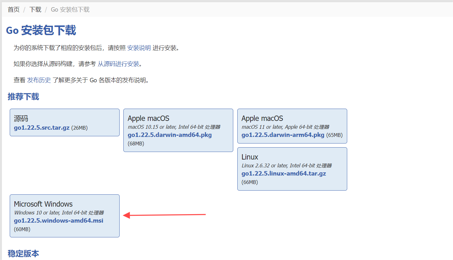 windows环境下下载go,安装地址:https://studygolang.com/dl。根据自己系统下载,什么版本都可